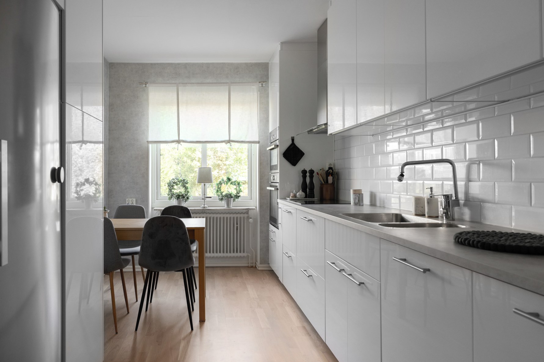 Direkt från hallen når ni bostadens moderna kök med härligt ljus från ett stort fönster. Köket har vit köksinredning med rostfria beslag kombinerat med en bänkskiva i grå laminat och ovanliggande stänkskydd i vitt kakel. Ni finner här optimal förvaring samt goda arbetsytor. Den maskinella utrustningen installerades 2019 och utgörs av induktionshäll, kolfilterfläkt, inbyggd varmluftsugn, inbyggd mikro-ugn, integrerad diskmaskin samt kyl och frys i fullhöjd. Intill fönstret finner ni en given plats för matbord. På golvet ligger ljus parkett och i köket sitter tapeter i en grå ton.