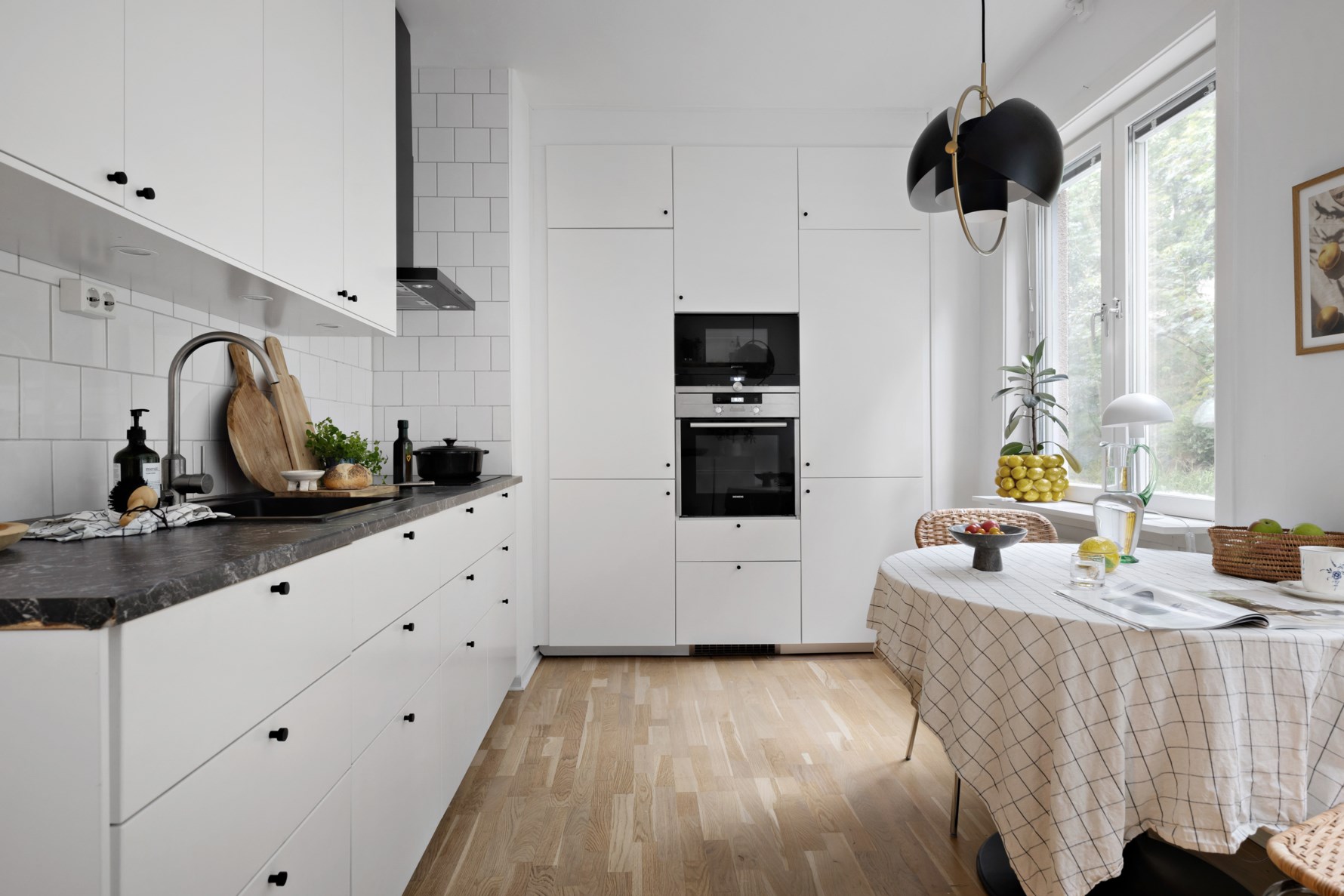 Vidare in till vänster kommer ni in i det ljusa köket med stora fönster mot den grönskande baksidan. Här finns det plats för matbord och stolar. Parkettgolv, vitmålade väggar och skåpsluckor, stänkskydd i vitt kakel och en stenliknande bänkskiva i mörk laminat skapar ett modernt och tilltalande kök. Köket är utrustat med induktionshäll, fläkt, inbyggd mikro och ugn från Siemens, kombinerade kyl med frys samt diskmaskin. Både kyl/frys och diskmaskin är integrerade. Köket renoverades år 2015 och är från Ikea.