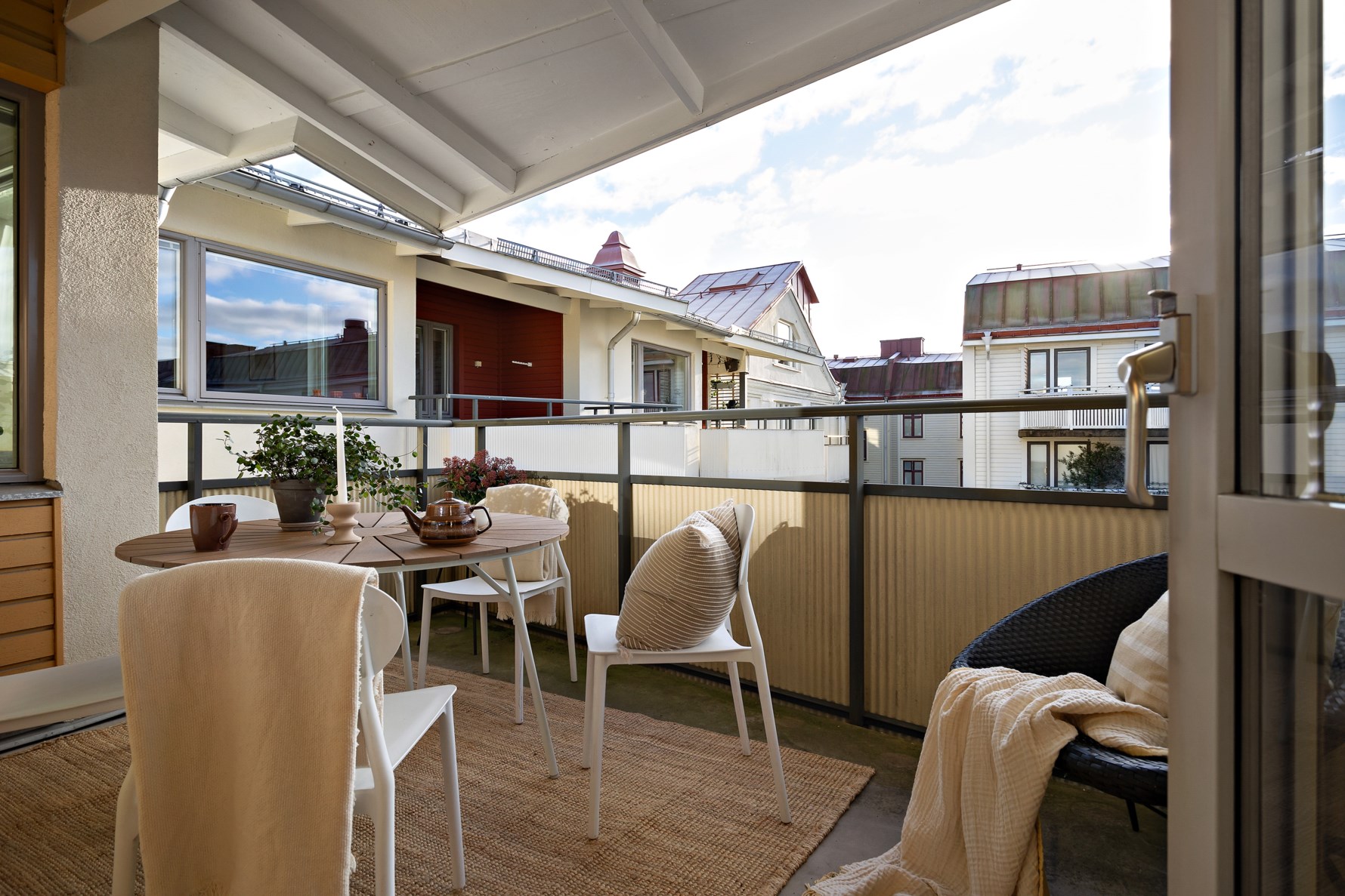 Stort och sällskapligt kök med plats för matgrupp och utgången till bostadens underbara balkong i ett soligt söderläge. Balkongen är rymlig och erbjuder olika möbleringsalternativ. Köket har goda förvaringsmöjligheter i flertalet skåp samt utdragslådor. Bänkskivor i ek, diskbänk i rostfritt och stänkskydd i vitt kakel går fint ihop med luckor och lådfronter i trä. Den maskinella utrustningen består av spis med ugn, frånluftsfläkt, diskmaskin samt kyl och frys i fullhöjd.