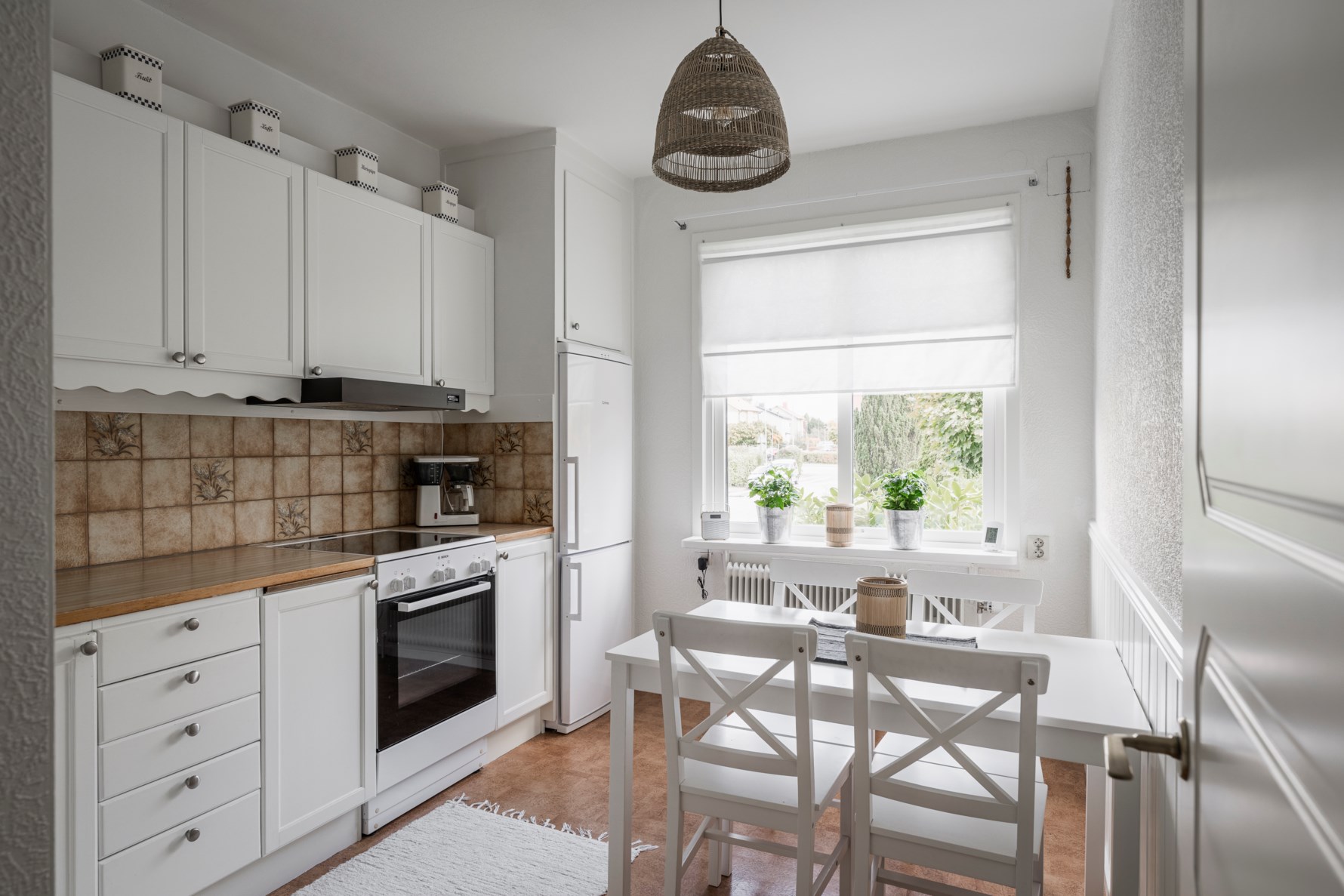 Köket är ljust och praktiskt, med generösa arbetsytor och smakfull inredning. De vita skåpen och det brunmönstrade kaklet som stänkskydd skapar en harmonisk och funktionell matlagningsmiljö. Fönstret i köket släpper in ett vackert ljus och bjuder på en härlig vy, hela vägen bort till den närbelägna busshållplatsen. Köket är utrustat med spis, ugn, fläkt samt kyl och frys – allt du behöver för att trivas i ditt hem.