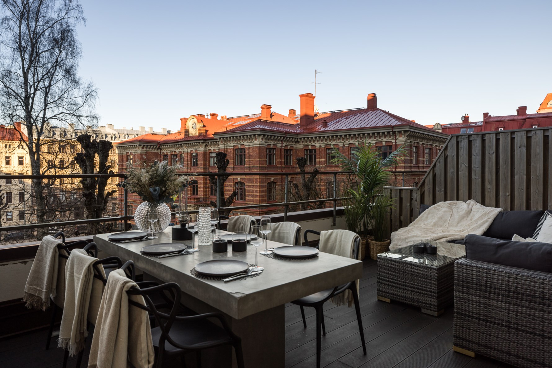I det sociala allrummet kombineras vardagsrum och kök som delas av med en stor köksö, perfekt att samlas runt vid sociala tillställningar. I vardagsrumsdelen ryms stor soffgrupp och matgrupp. Här strömmar ljuset in från de stora fönsterpartierna och dörren som tar er ut på terrassen. Bostadens terrass är mysig och stor, här ryms både matgrupp och större soffgrupp, med sitt läge i nordväst kan ni njuta av kvällssolen. Här ute har ni fin utsikt över Vasastadens vackra byggnader. Sommartid blir både terrassen och bostadens uteplats en förlängning av bostaden. Uteplatsen, som ligger skyddad under en balkong, kan användas även vid regn. Terrassen är utrustad med en markis som enkelt kan dras ut, vilket gör att den också går att nyttja oavsett väder.