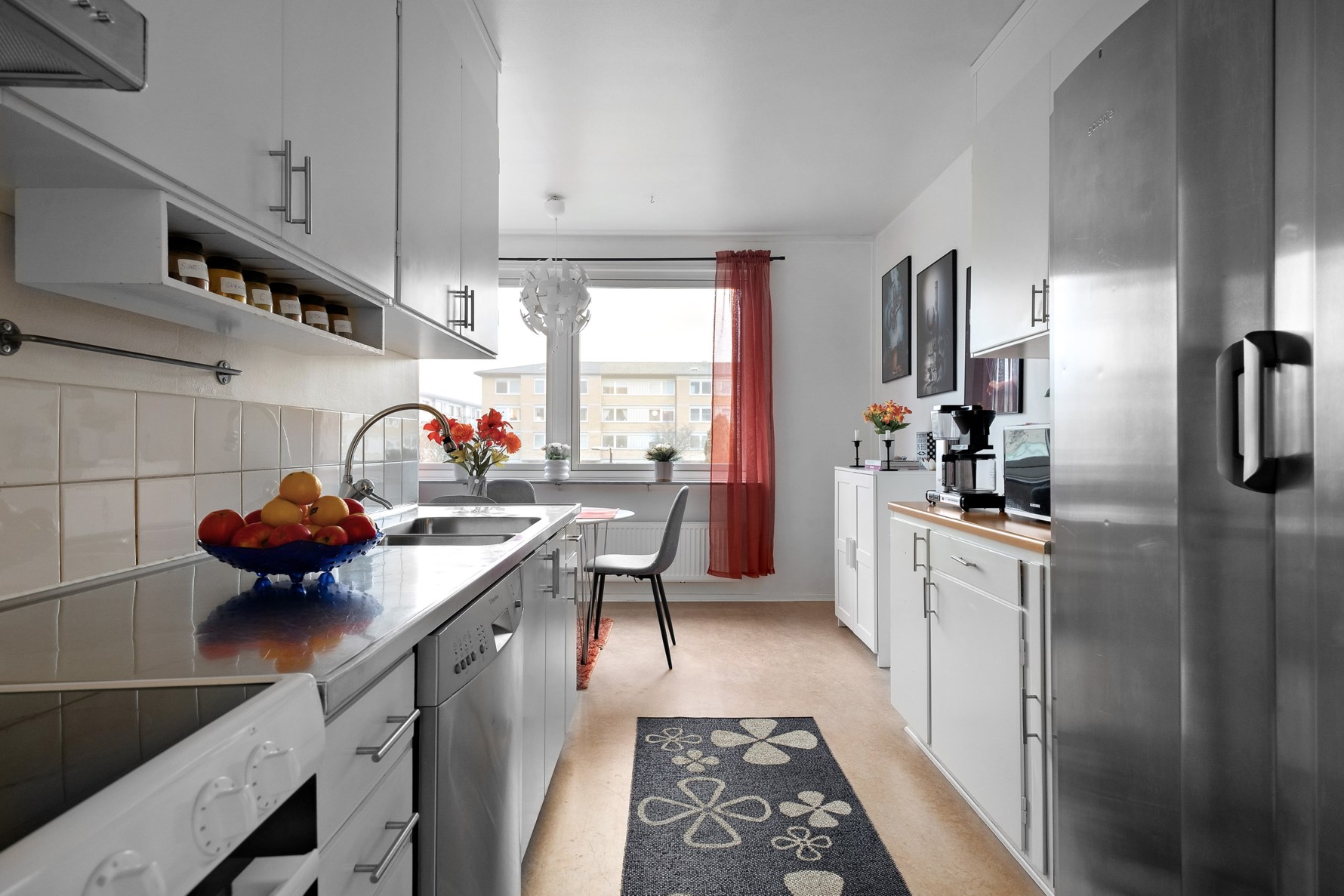 Bostadens kök erbjuder gott om förvaring bakom många luckor och skåp samt generösa arbetsytor. Den maskinella utrustningen utgörs av spis, fläkt, diskmaskin samt kyl och frys i fullhöjd. Invid fönsterna i köket finns generöst med yta för ett matsalsbord samt möjlighet att sätta upp en vägg för att skapa ännu ett sovrum som kan fungerar perfekt som barnrum, gästrum eller kontor.