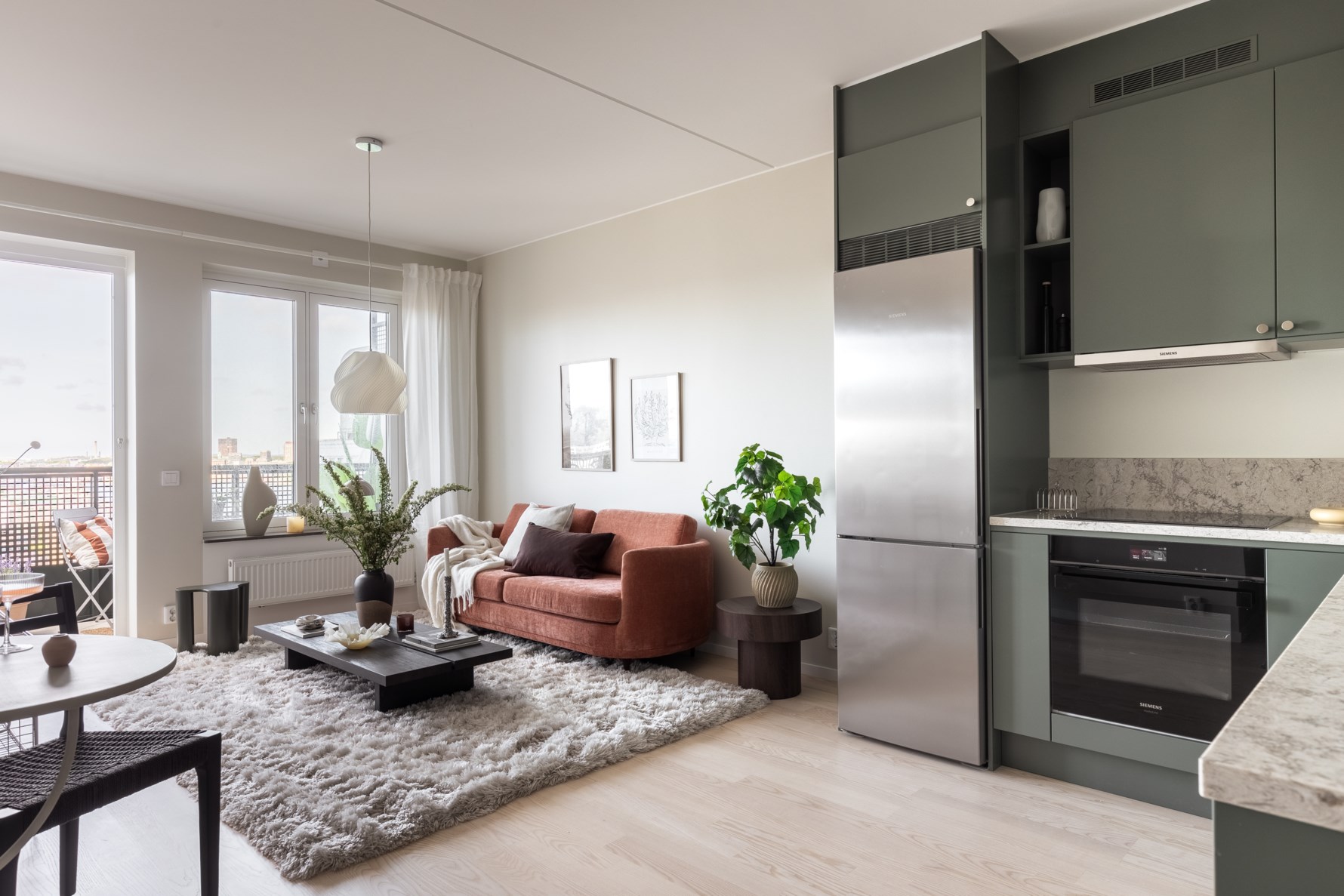 Bostaden har vardagsrum och kök i öppet samband vilket skapar fina sällskapsytor som kan möbleras med soffa och matsalsbord. Fint ljusinsläpp samt utgång till en härlig balkong med högt läge som ger en fantastisk vidsträckt utsikt över staden.