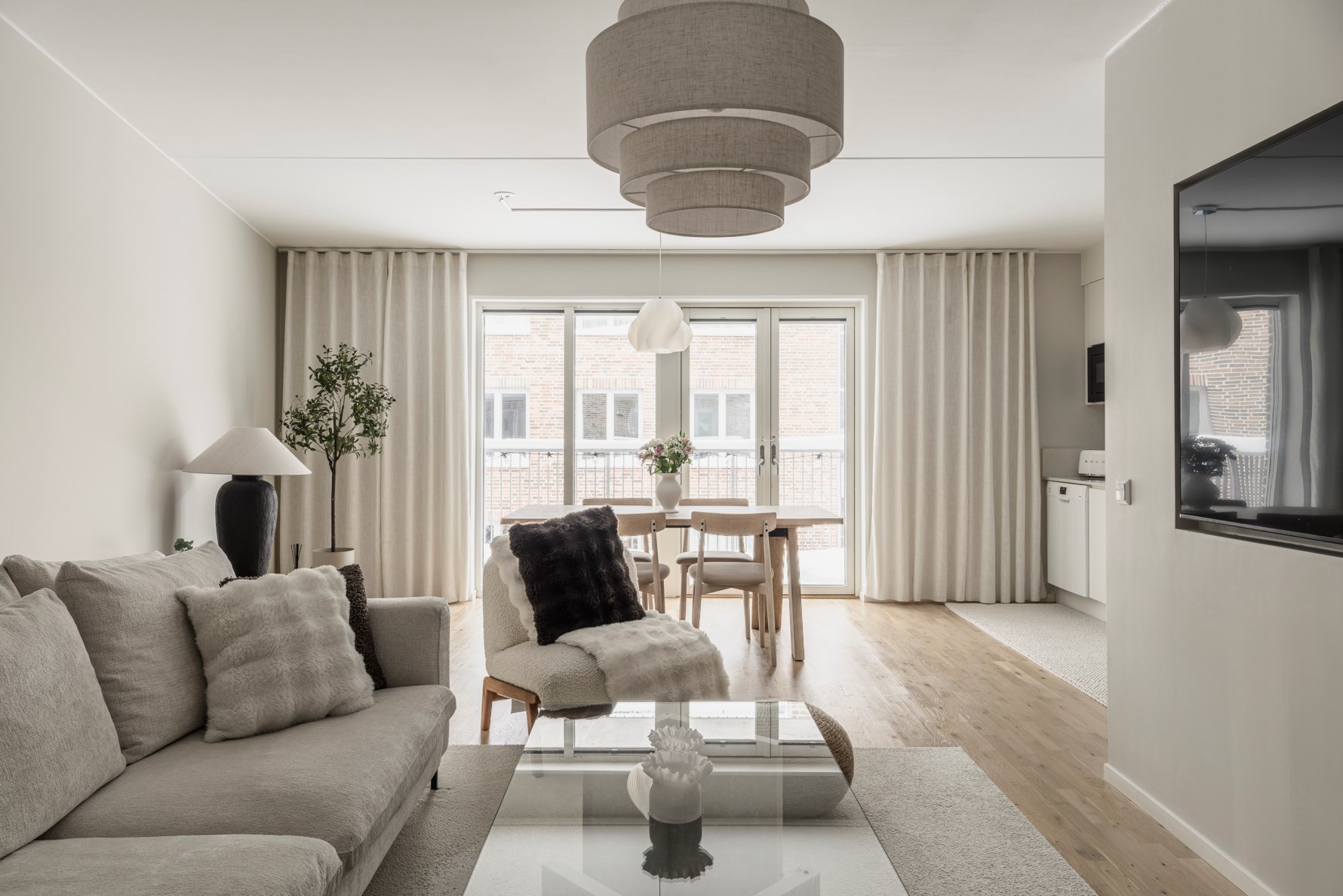 Vardagsrummet är generöst tilltaget och präglas av det stora, obrutna ljusinsläppet från fönsterpartier som sträcker sig från golv till tak. Träparketten samspelar fint med de ljusa väggarna och skapar en tidlös helhet. Rummet rymmer enkelt både soffgrupp, tv-möbel och matplats. Härifrån nås den soldränkta balkongen i lugnt gårdsläge – en rogivande och insynsskyddad plats med möjlighet till en liten loungegrupp, perfekt för avkopplande stunder i ett soligt och grönt sammanhang.