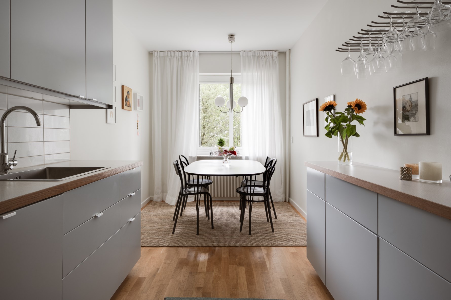 Stilrent kök som renoverades 2016. Ljusgrå köksinredning från Ikea med släta luckor och diskreta beslag, laminatbänkytor i det klassiska mönstret ”Virrvarr” samt stänkskydd i vitt kakel. Den maskinella utrustningen utgörs av induktionshäll (Electrolux), fläkt (Franke), inbyggnadsugn med varmluftsfunktion (Electrolux), integrerad diskmaskin (Electrolux) samt integrerad kyl med frys (Electrolux). Köket erbjuder gott om förvaring och generösa arbetsytor. Golvet kläs av ekparkett och väggarna målade i vitt. Invid fönstret som har härlig grönska utanför finns en given plats för en matplats för fyra till sex personer.