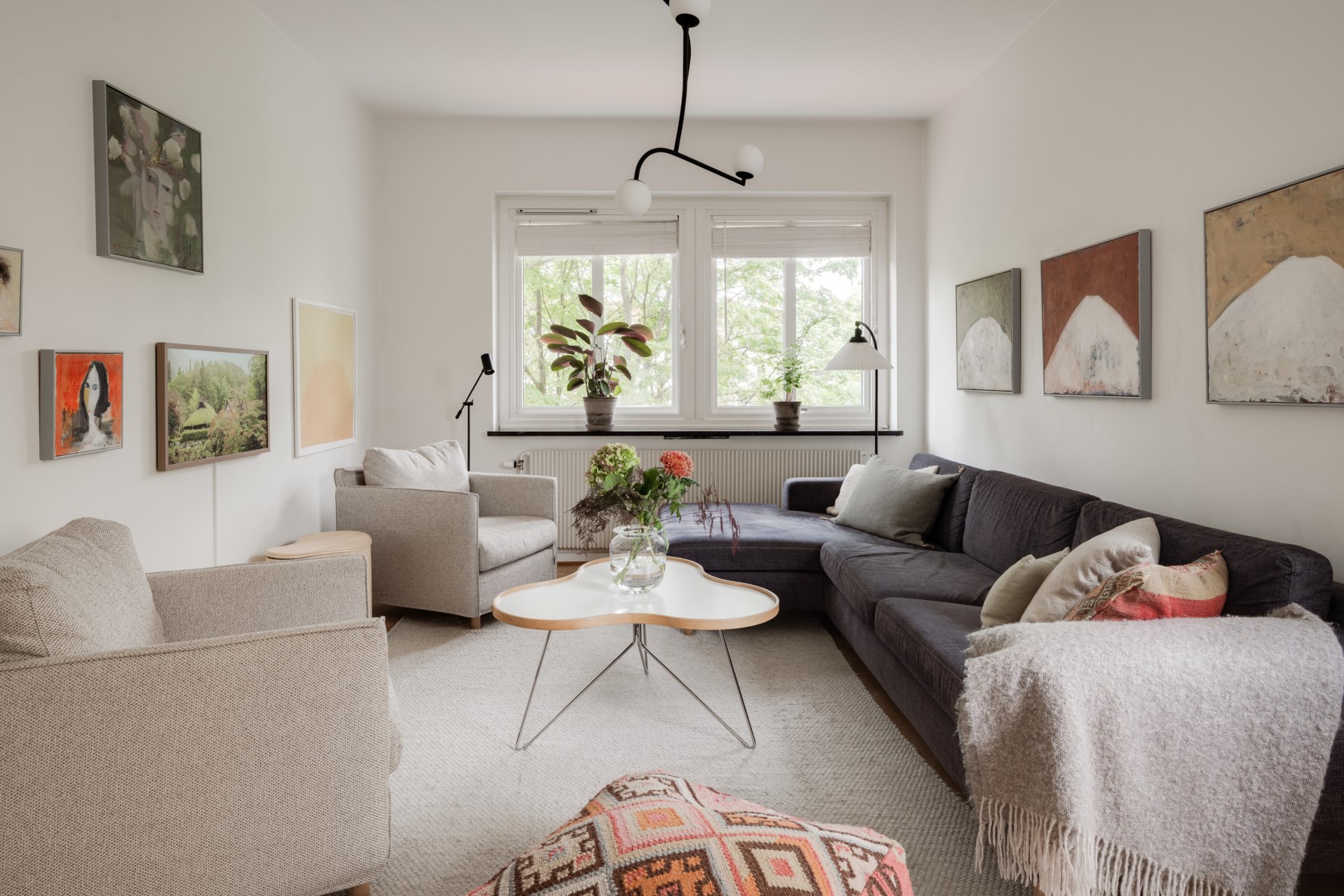 Trivsamt och socialt vardagsrum i gavelläge med ljusinsläpp från fönster i två väderstreck. Vardagsrummet kan inredas med soffa, matsalsbord samt övrig inredning. Golvet kläs av tidstypisk fiskbensparkett och väggarna är målade i vitt.