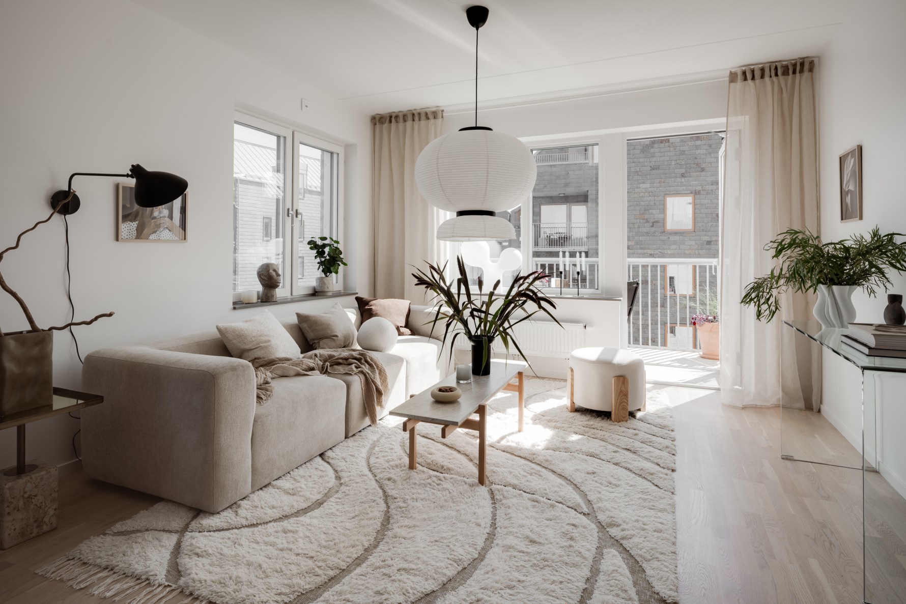 Rymligt och ljust vardagsrum med stora fönster som släpper in rikligt med naturligt ljus. Här finns gott om plats för både soffgrupp och matplats. Den öppna planlösningen mot köket ger en luftig och social atmosfär.