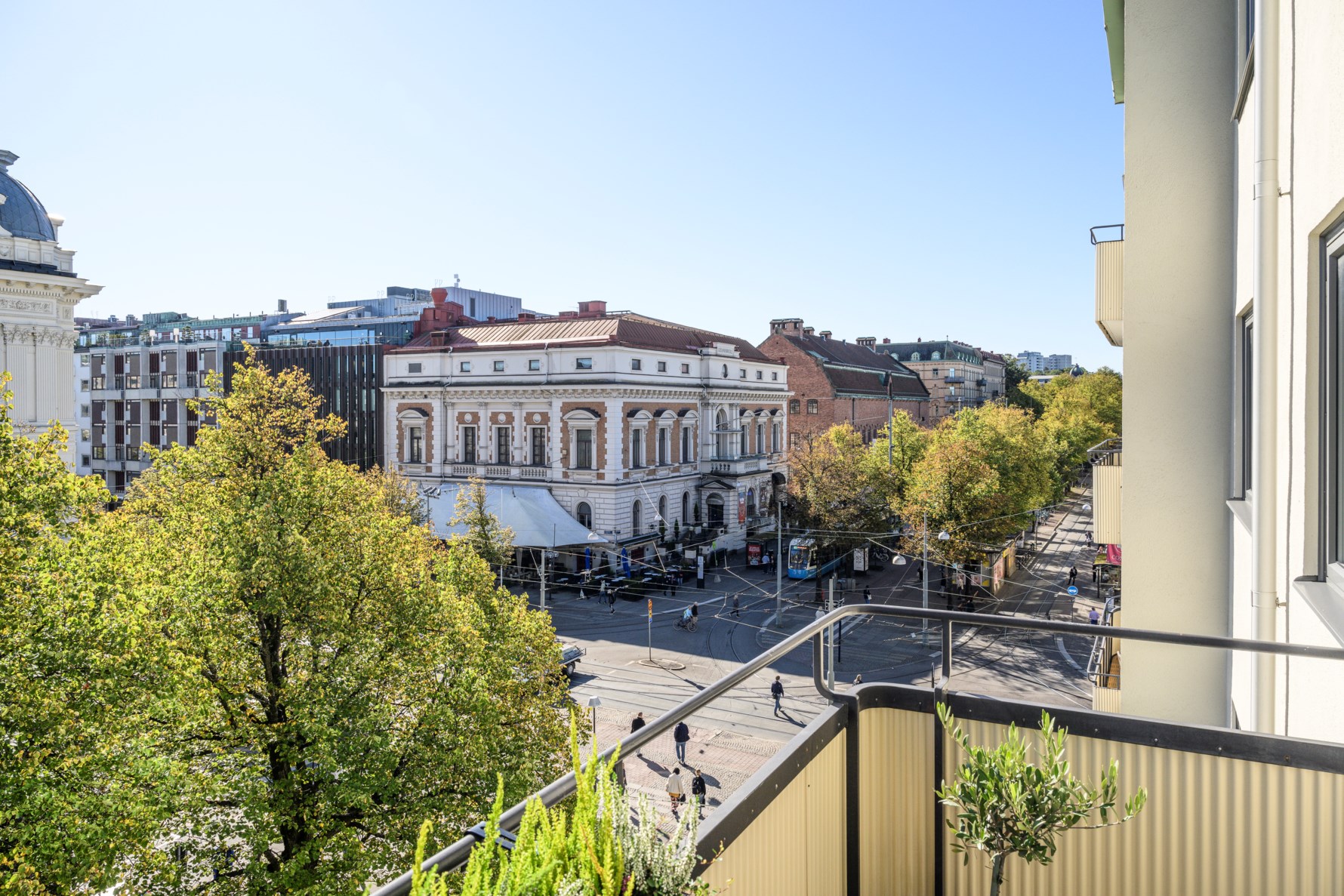 Ljust och härligt vardagsrum som präglas av vacker fiskbensparkett, tidstypisk öppen spis och stort fönsterparti med rogivande grönska utanför. Härifrån nås lägenhetens balkong som har soligt sydvästligt läge med utsikt över Avenyn och Valand.