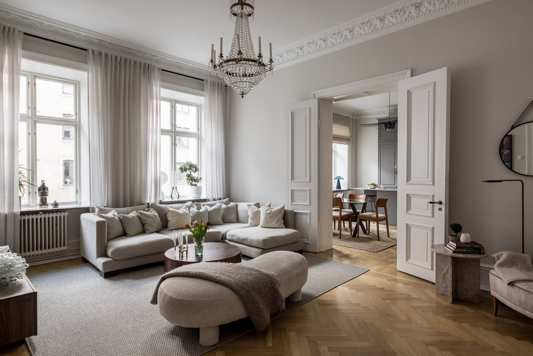 I anslutning till köket ligger vardagsrummet i fil, även det med fiskbensparkett, putsade och nymålade väggar från 2024, hökt i tak med vackra originalstuckaturer och takrosetter. Rummet erbjuder generösa ytor och stora fönster som ger ett fantastiskt ljusinsläpp.