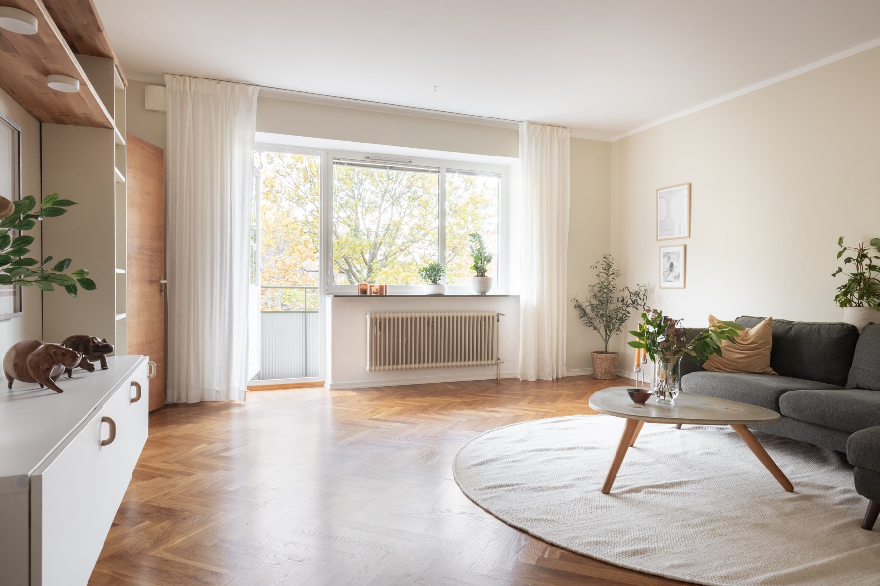 Trivsamt vardagsrum med härlig eftermiddagssol som präglas av lummig grönska utanför de stora fönsterpartierna. Härifrån nås även den eftertraktade balkongen med rofyllda och tysta omgivningar. Vardagsrummet kan inredas med soffa och övrig inredning. Golvet kläs av fiskbensparkett och väggarna är målade i en beige ton.