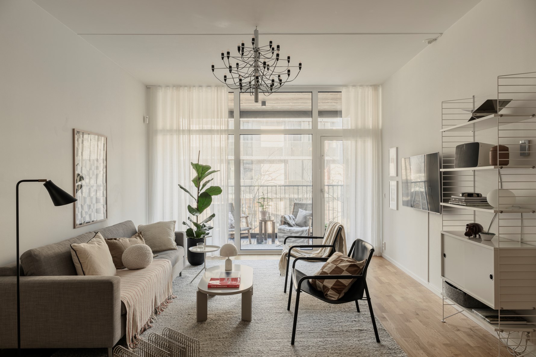 Vardagsrummet är generöst och präglas av ett imponerande ljusinsläpp från stora fönsterpartier som sträcker sig från golv till tak. Här ryms såväl soffgrupp och TV-möbel som matplats för större sällskap. Från vardagsrummet nås den inglasade balkongen i nordvästläge, en trivsam förlängning av bostaden och en skyddad plats för avkoppling under stora delar av året.