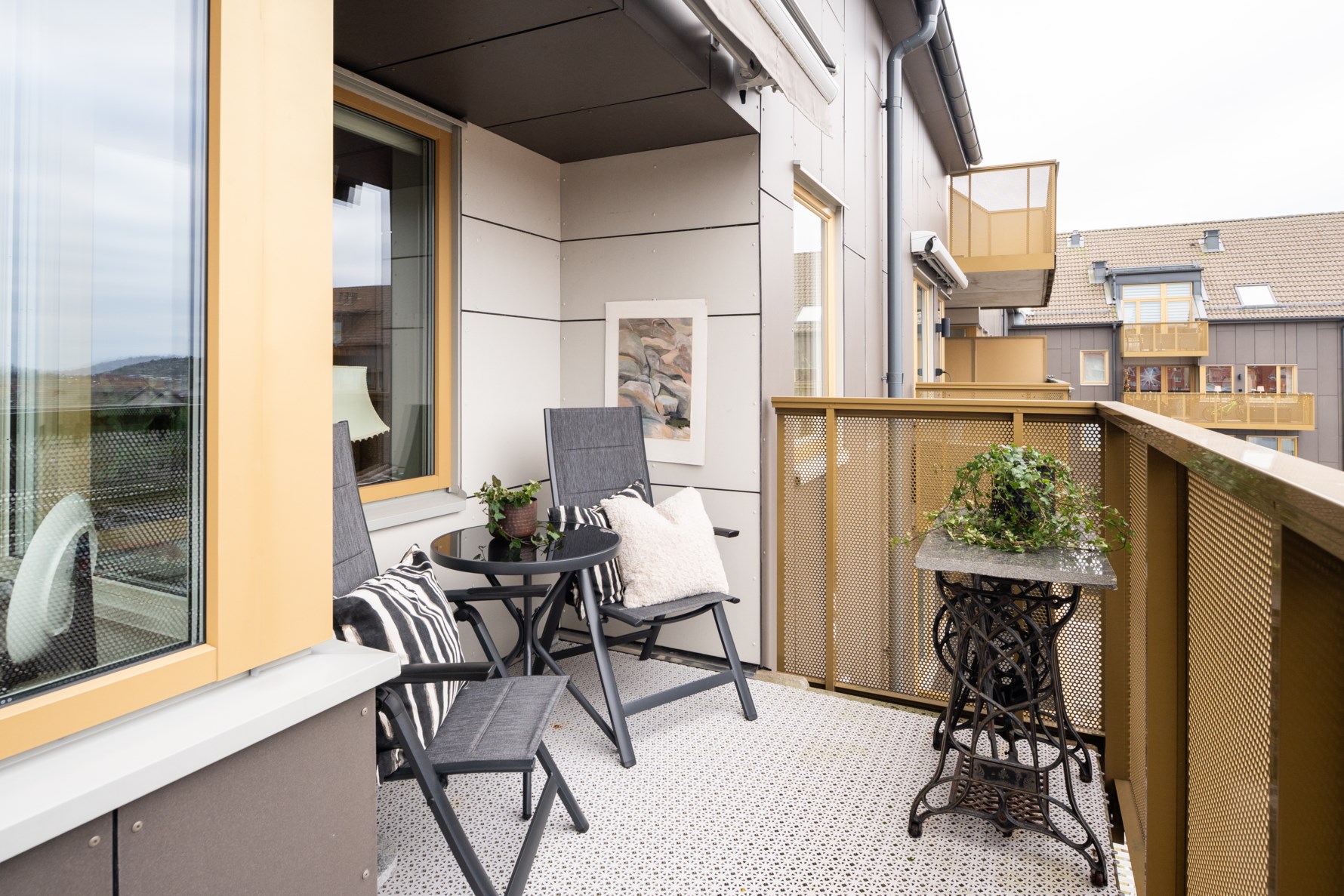 Den öppna planlösningen mellan köket och vardagsrummet ger ett ljust och luftigt rum med plats för både soffa och matbord. Den härliga balkongen blir som en förlängning av rummet och erbjuder många soltimmar i söderläge. Önskar man skugga kan man helt enkelt fälla ner markisen.