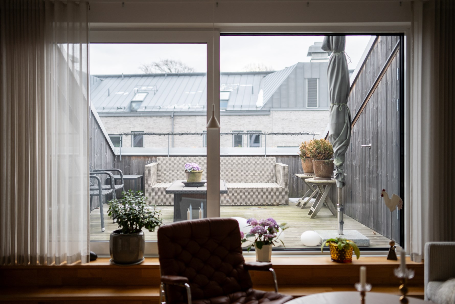 Ett par steg in möter ni det otroligt fina ljusinsläppet som kommer från två väderstreck. I varje rum finner ni stora fönsterpartier från golv till tak som öppnar upp och skapar en oslagbar rymd. Detta hem har mycket karaktär med en ovanligt generös takhöjd och på vissa platser öppet upp till nock. Den öppna planlösningen mellan vardagsrum och kök bidrar till goda ytor att umgås på. Vardagsrummet erbjuder flera möbleringsalternativ och är idag inrett som matsal där hela familjen får plats och samlas efter en lång dag för en god middag. Härifrån når ni en av bostadens balkonger. Här ute går det utmärkt att inreda med bord och stolar och är en plats att nyttja hela året som ett extra rum då balkongen är inglasad.