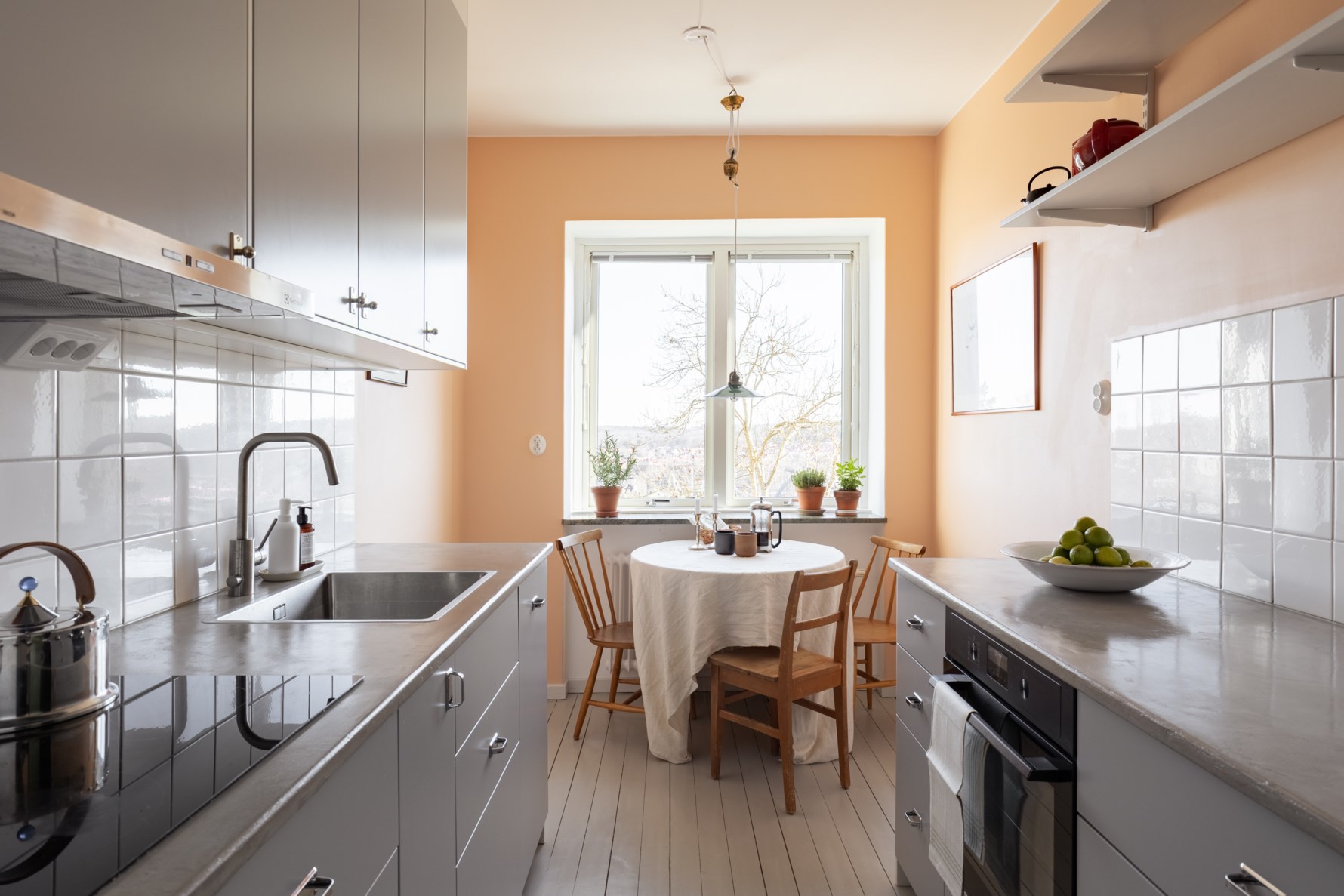 Köket som renoverat 2024 är ett tydligt exempel på bostadens genomtänkta stil där funkisens formspråk möter moderna material. Släta ljusgrå luckor med tidsenliga beslag kombineras med bänkskiva i microcement och klassiskt vitt kakel. Den maskinella utrustningen utgörs av induktionshäll, kolfilterfläkt, inbyggnadsugn, integrerad diskmaskin samt integrerad kyl med frys. Samtliga vitvaror är installerade 2024 förutom fläkten som är från 2020. Matplatsen har sin naturliga placering vid fönstret där ljuset strömmar in och den vidsträckta utsikten blir en del av rummet. I köket är plankgolvet målat i linoljefärgen ”Varmgrå” från Ottosson och väggarna är målade i den persikorosa färgen ”Burton pink” från Little Green tillsammans med snickerier i linoljefärgen ”Ljusgrå” från Ottosson.