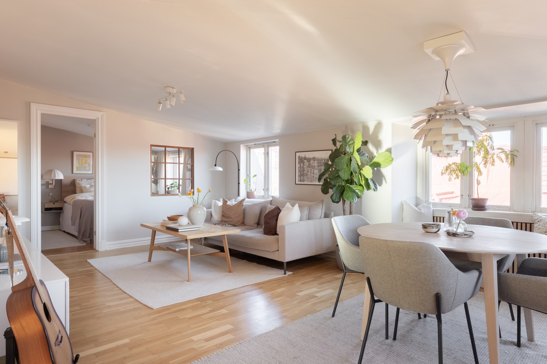 Vardagsrummet har generösa ytor som inbjuder till socialt umgänge med plats för både soffa och matsalsbord för större sällskap. Rummet har ett härligt hörnläge med fint ljusinsläpp från fönster i två väderstreck som stoltserar med vidsträckt utsikt över takåsarna från norr till öst. Vid ett av fönstren finns en platsbyggd bänk med förvaring. Den öppna planlösningen mot köket binder samman sällskapsytorna.
