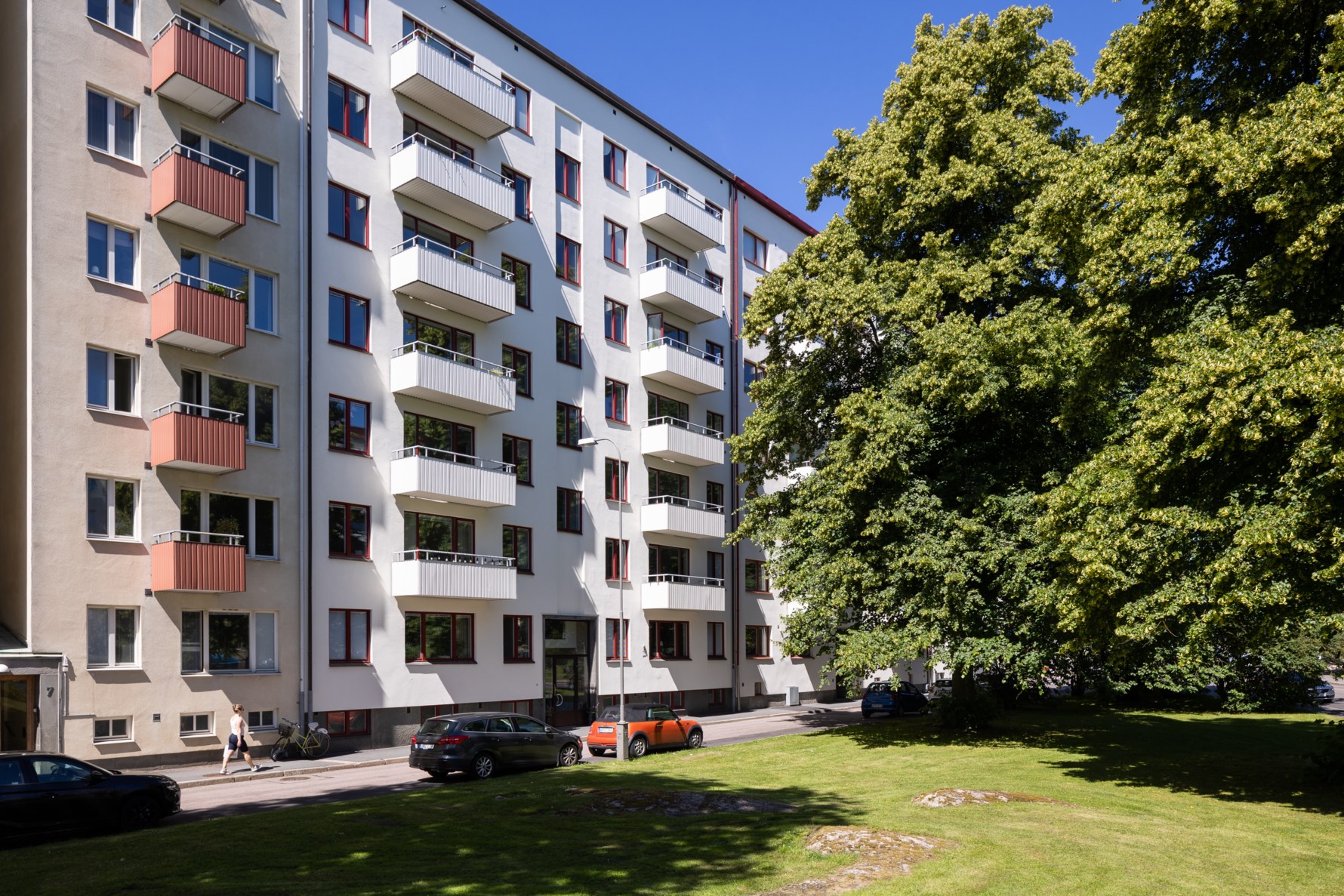 Underbara sällskapsytor med härlig rymd som präglas av vacker fiskbensparkett och ett otroligt ljusinsläpp tack vare stora fönster i högt läge. Härifrån når man bostadens balkong som är belägen i öster med utsikt över grönskande omgivningar. Vardagsrummet erbjuder flera olika möbleringsalternativ och den stora öppningen mot köket skapar gemenskap.