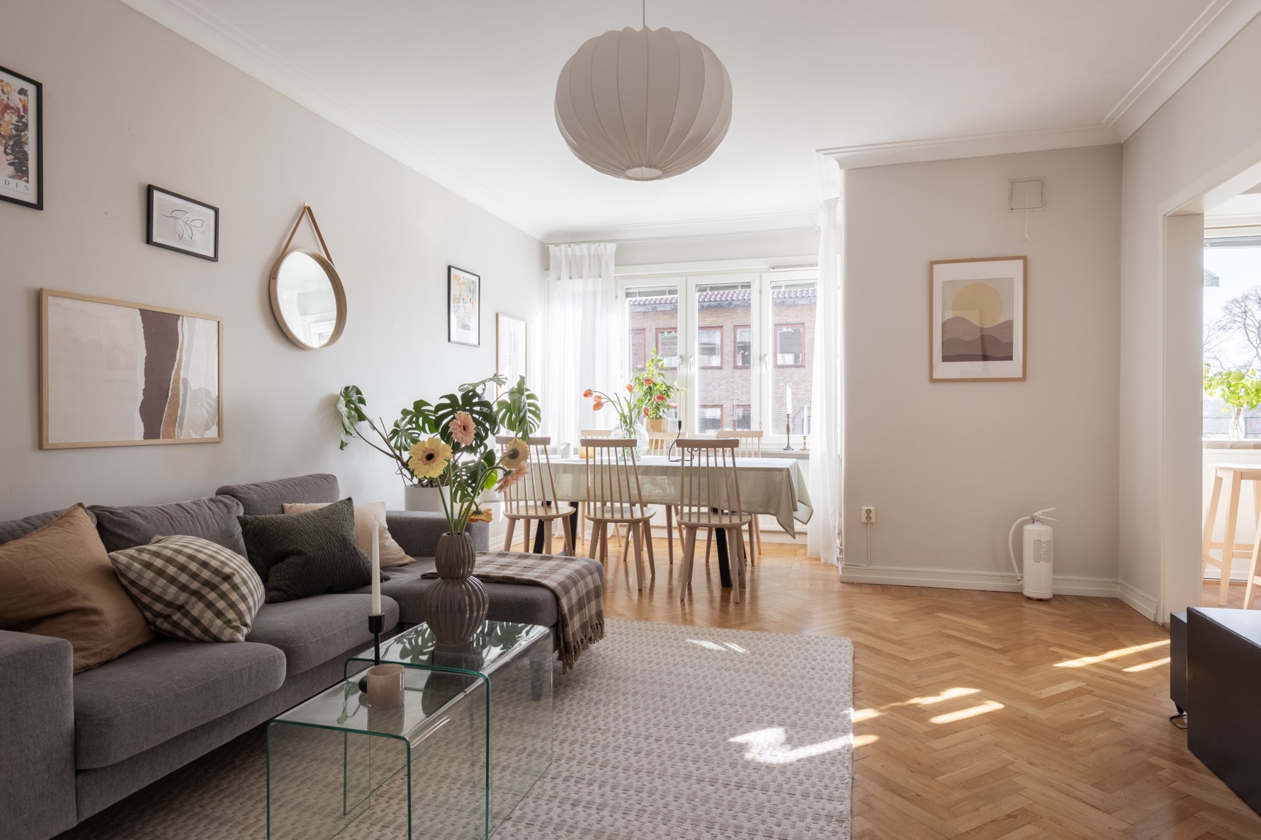 Vidare in möts man av det sociala vardagsrummet som erbjuder generösa sällskapsytor som kan möbleras med soffa, tv-bänk, matsalsbord, vitrinskåp och förvaringsskåp. Ett stort fönsterparti i söderläge bjuder på fantastiskt ljusinsläpp och skapar en härlig atmosfär. Golvet kläs av välbevarad ekparkett i klassiskt fiskbensmönster och väggarna är målade i ljusgrått med vit stuckatur.