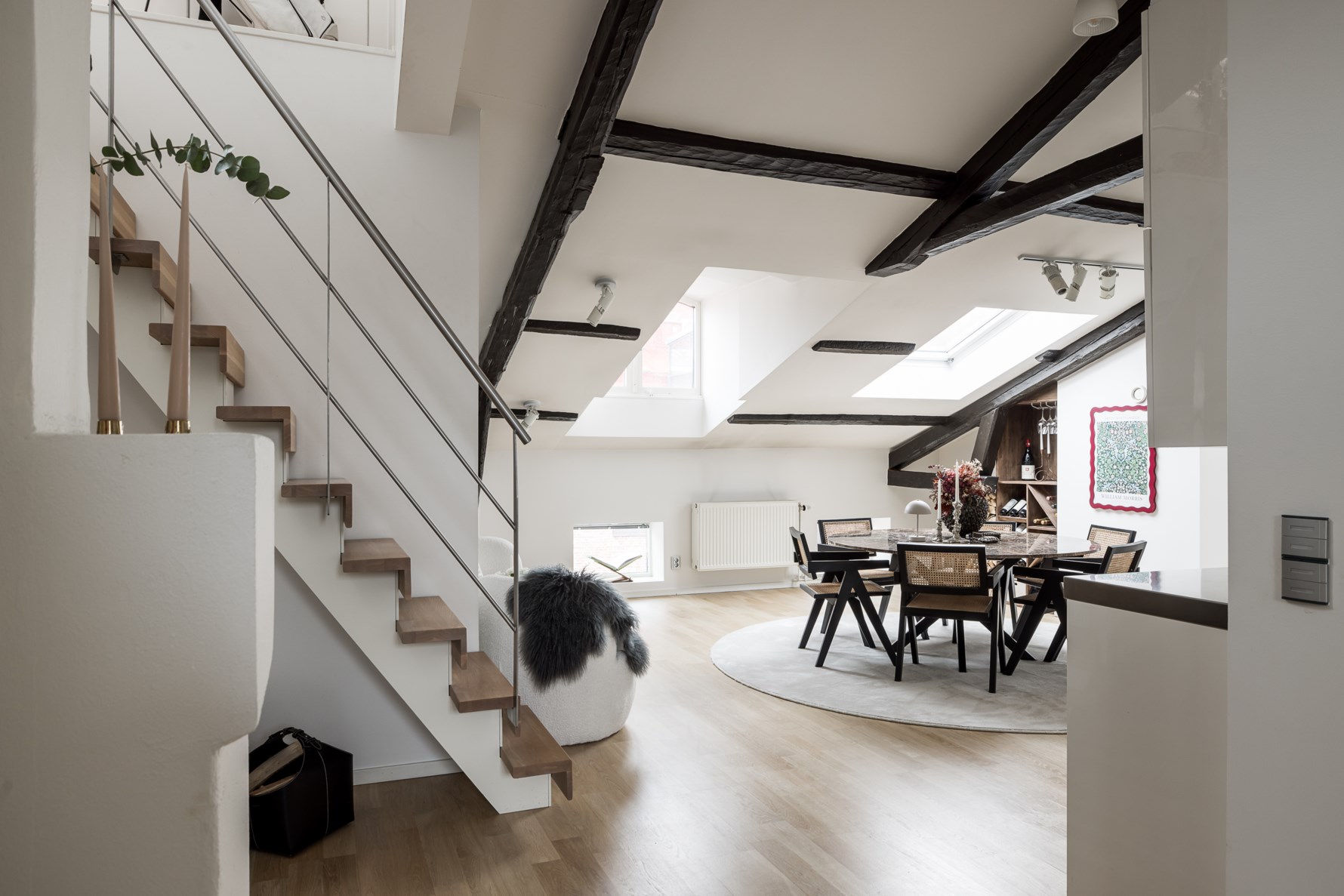 En stilren trappa i trä och metall leder vidare upp till bostadens loftplan – en flexibel yta som lämpar sig utmärkt som extra sällskapsdel, arbetsplats eller privat lounge. Här fortsätter den arkitektoniska känslan med snedtak, synliga bjälkar och takfönster som skapar ett vackert ljusinsläpp.