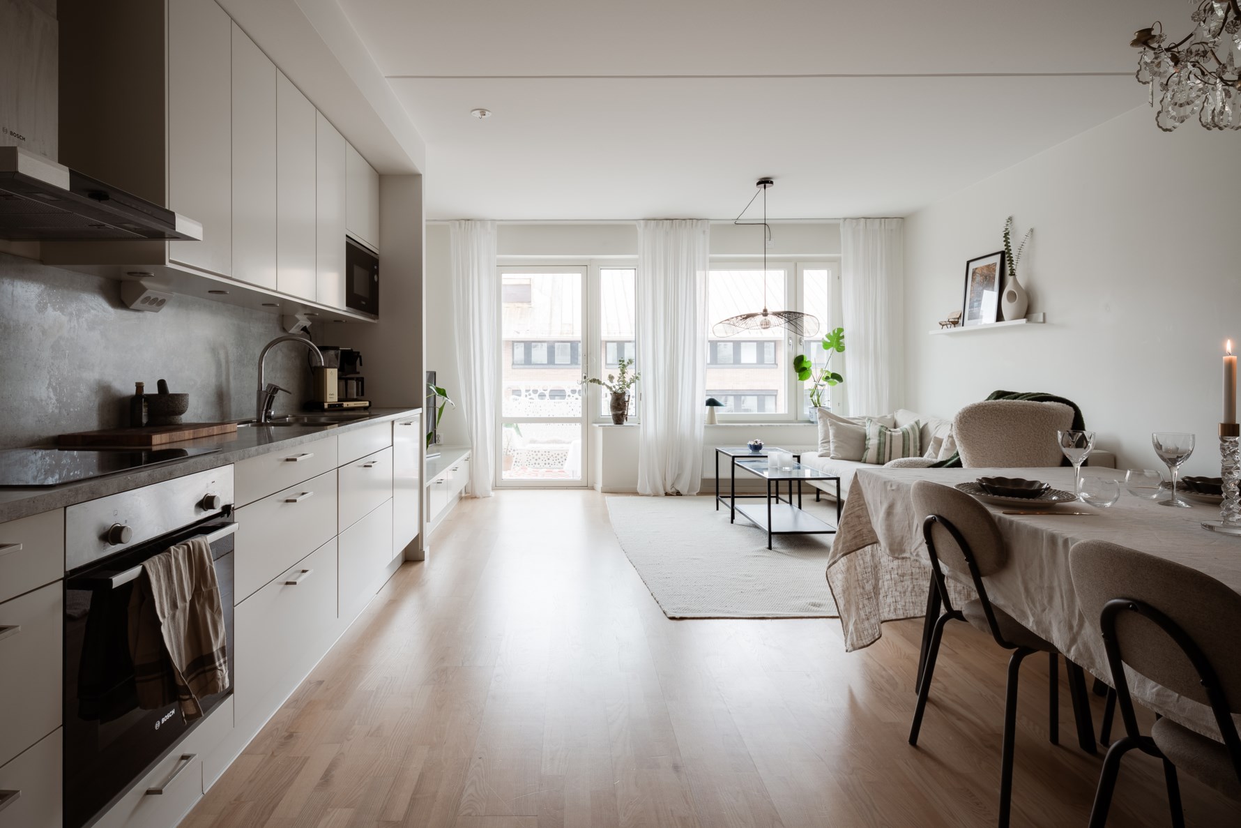 Lägenheten har vardagsrum och kök i öppen planlösning som präglas av rikligt ljusinsläpp. Den moderna planlösningen ger möjlighet till olika möbleringsalternativ och bjuder in till sociala umgängen och trivsel. Väggarna som är målade i Stockholmsvitt bryts av med en mönstrad fondtapet från William Morris som ger en personlig touch. Stora fönsterpartier med fönsterbänkar i marmor samt utgång till lägenhetens balkong i perfekt söderläge där man tack vare det höga fria läget kan njuta av sol från morgon till sen eftermiddag.