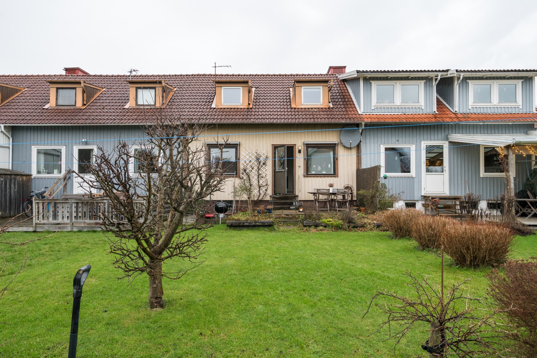 Direkt till vänster finns köket som har köksluckor i ek och gott om skåpförvaring. Ovanför bänkskivan sitter ett rött kakel. Köket är utrustat med kombinerad kyl/frys, spis, fläkt och diskmaskin. På golvet ligger ett linoleumgolv och väggarna går i en ljus ton. Därefter ligger vardagsrummet som är rejält tilltaget. Här får både en soffgrupp samt matsalsbord plats. Går att dela av till ett extra sovrum om man har behov av det. Golvet pryds av ekparkett och väggarna är tapetserade i en vit ton. Här finns utgång till uteplatsen i perfekt söderläge. Uteplatsen är stenbelagd och övergår i en trädgårdstäppa med vindruvsrankor och äppelträd. En oas att njuta på under fina sommardagar. På entréplan finns även ett sovrum som idag används som arbetsrum. På golvet ligger plankgolv och en vit strukturtapet pryder väggarna.