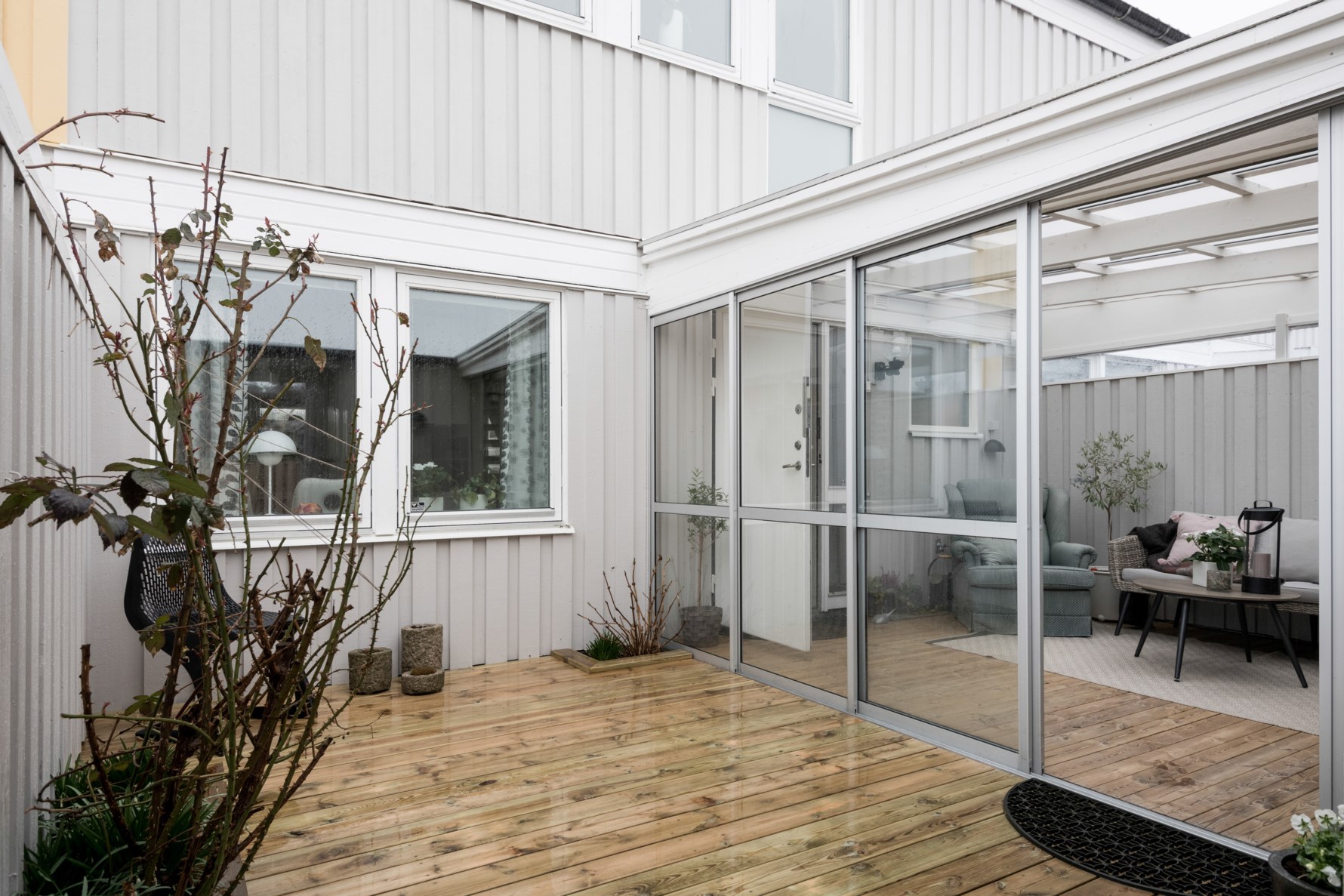 En mysig och nylagd träaltan leder oss mot entrén. Det första man möts av är det stora inglasade partiet, fritt från insyn och fantastisk plats för umgänge både sommar som övriga årstider. Här kan man öppna upp glaspartierna och duka upp långbord för sommargästerna. De stora fönsterpartierna från vardagsrummet ger ett härligt ljusinsläpp till välkomnandet. Golvets ekparkett breder ut sig från hallen till vardagsrummet som tillsammans med de ljusa fina väggarna, hallgarderoberna med spegeldörrar och den öppna trappan ger ett klassiskt och hemtrevligt första intryck. Härliga sällskapsytor som bland annat utgörs av ett kök från Ikea med vita och svarta skåpsluckor och grå laminatbänkskiva. Den maskinella utrustningen består av kyl och frys i fullhöjd (Samsung 2016), diskmaskin (Cylinda, 2019), spis med ugn (Bosch, 2017). Från både kök och hall når ni smidigt vardagsrummet som ni kan inreda med en större soffa, fåtölj och TV med en anslutande del för middagsbord. Härifrån kliver ni ut på den härliga uteplatsen med både en trevlig altandel under tak och en gräsyta med planteringar och grönska som omsluter baksidan. Perfekt för avkoppling i förmiddagssolen under sommaren eller för den grillsugna oavsett årstid! Vidare har vi givetvis en gäst-WC och tvättstuga i anslutning till entrén, praktisk utformad med klinker på golv, arbetsbänk, tvättmaskin (Siemens 2013) och torktumlare (Cylinda) samt överskåp.
