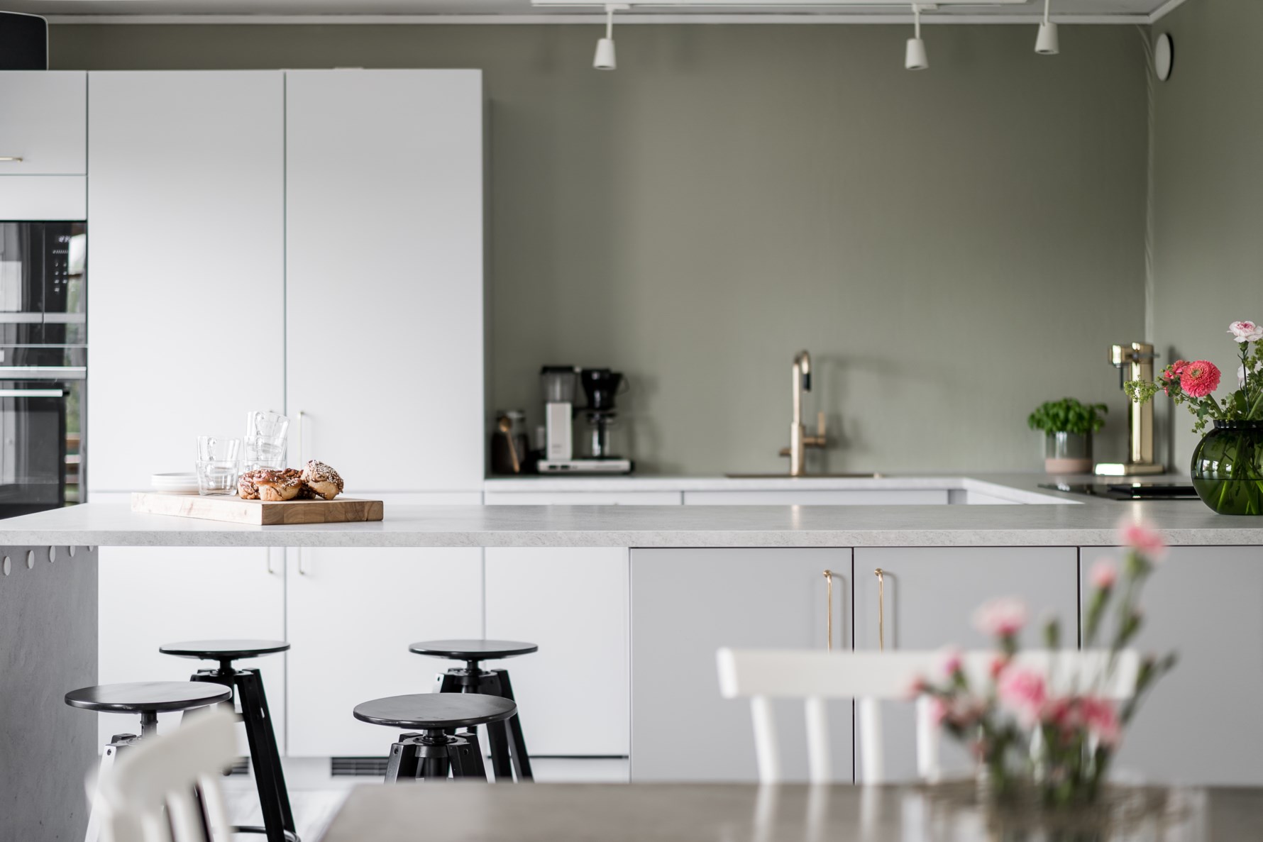 Stilrent kök från Kvik som totalrenoverades 2020. Köksluckor i en ljuvlig ljusgrå nyans och ljust målade väggar i vitt och grönt. Utrustningen från Siemens och Bosch består av diskmaskin, induktionshäll med integrerad bänkfläkt, varmluftsugn med ångfunktion och mikro i ergonomisk arbetshöjd samt dubbla kombinerade kyl och frys. Den öppna planlösningen med en gedigen köksö mot vardagsrum ger möjlighet till härliga sociala middagar och här har man en enkel access till den soldränkta baksidan. På baksidan spenderar nog de flesta gärna mycket tid årets varmare månader då det finns plats för både lek, utekök och långbord.