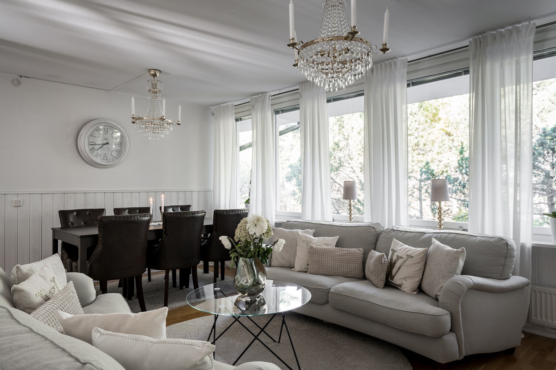 Några steg in når ni vardagsrummet som avgränsas av en trappa som knyter an samtliga tre plan. Rummet har fönster från vägg till vägg mot uteplatsen och en lummig grönska vilket bidrar till fint ljusinsläpp och rymd. Här får ni plats med ett stort matsalsbord för familjens samlade middagar eller födelsedagskalaset. Ni har även plats för en stor soffgrupp för socialt umgänge. Väggarna här är vitmålade och på golvet ligger ett vackert parkettgolv.