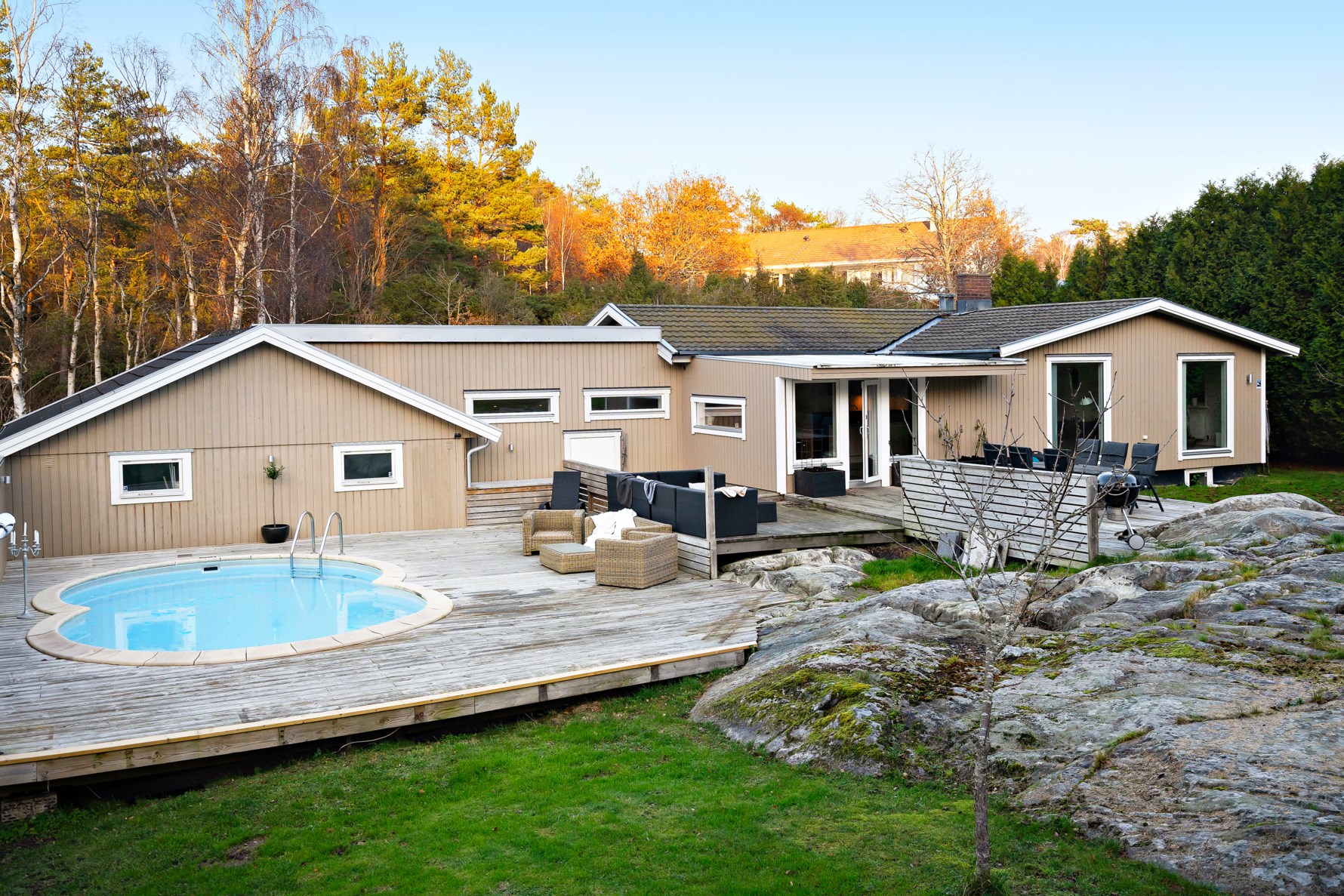 Från hallen leder trappor upp till entréplan samt ner till källarplan. Köket ligger i anslutning till både vardagsrummet och altanen och har en modern utformning med vita eller frostade skåpsluckor och lådfronter med mattborstade stålhandtag. Gott om både förvaring och arbetsyta. Mörka laminat bänkskivor och stänkskydd samt vitt kakel på väggarna. Induktionshäll samt rostfri fläkt. Inbyggd ugn och mikro. Kyl och frys behöver bytas ut. Grått stengolv och en altandörr som leder ut till husets poolsida.