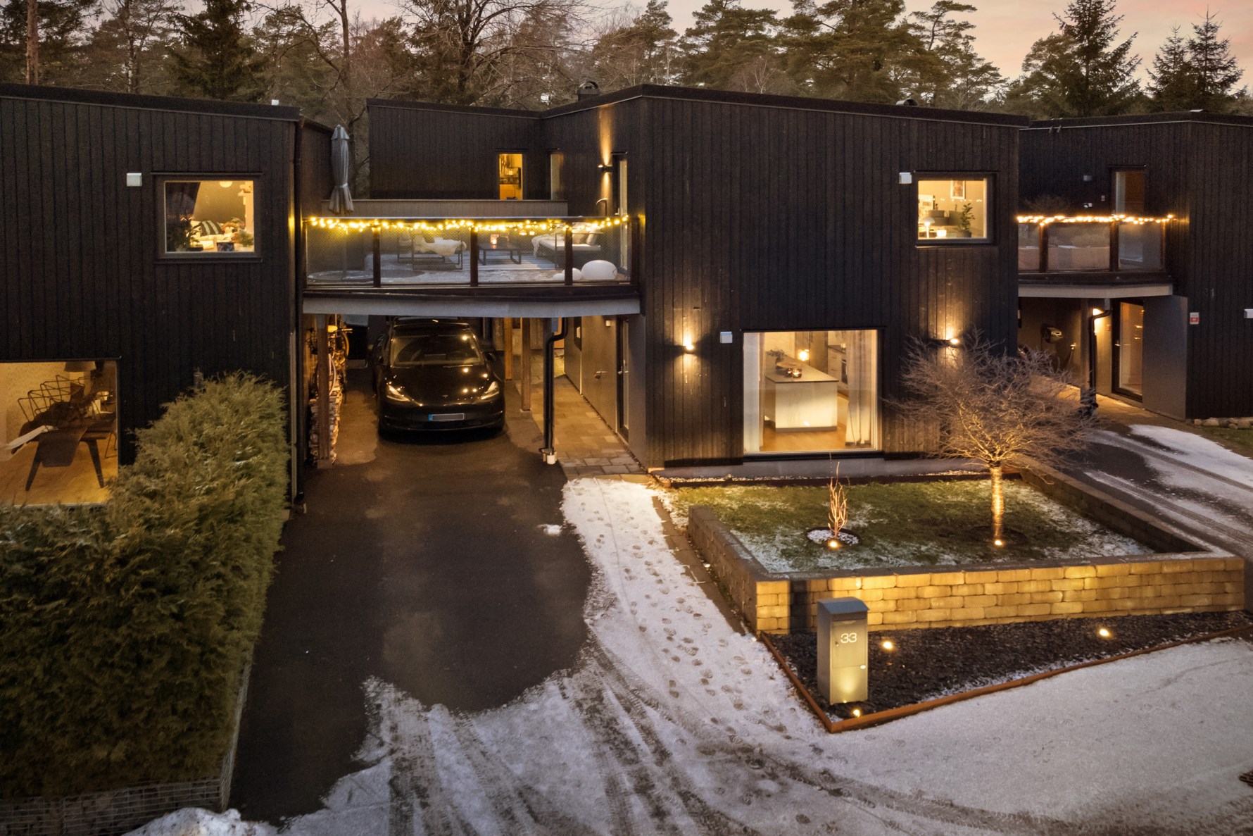 Fastigheten är utrustad för ett modernt liv med energieffektiva lösningar och genomtänkt belysning, inklusive LED-lister och spotlights vid carport och passage.