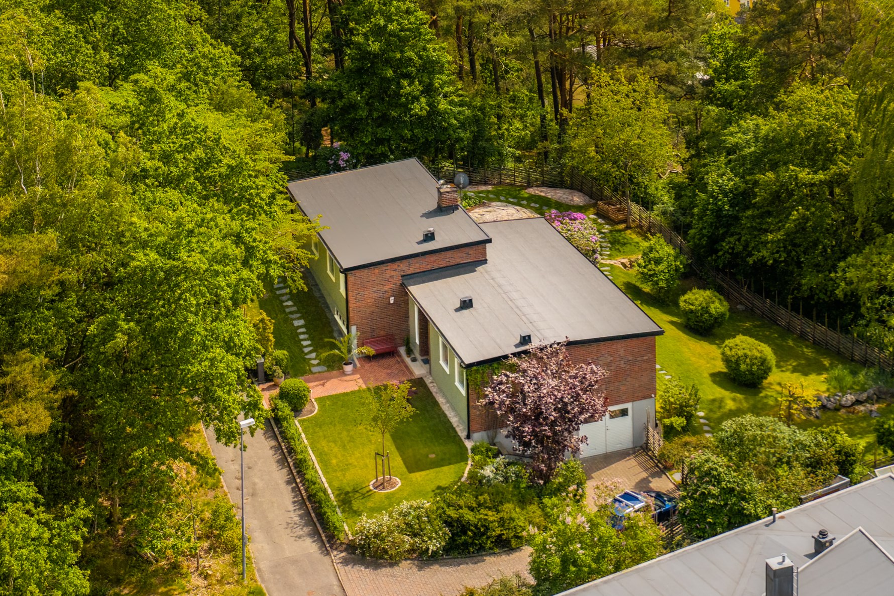 Direkt anslutande ligger det generösa vardagsrummet och matsalen i fil, med en imponerande fönsterlänga som utblickar trädgården och områdets villor sett uppifrån. Ett perfekt rum för sociala tillställningar eller familjesammankomster. På golvet ligger ett fiskbensparkettgolv i gott originalskick och taket är belagt med träplankor vilka i matsalen är vitmålade men i vardagsrummet trärena.