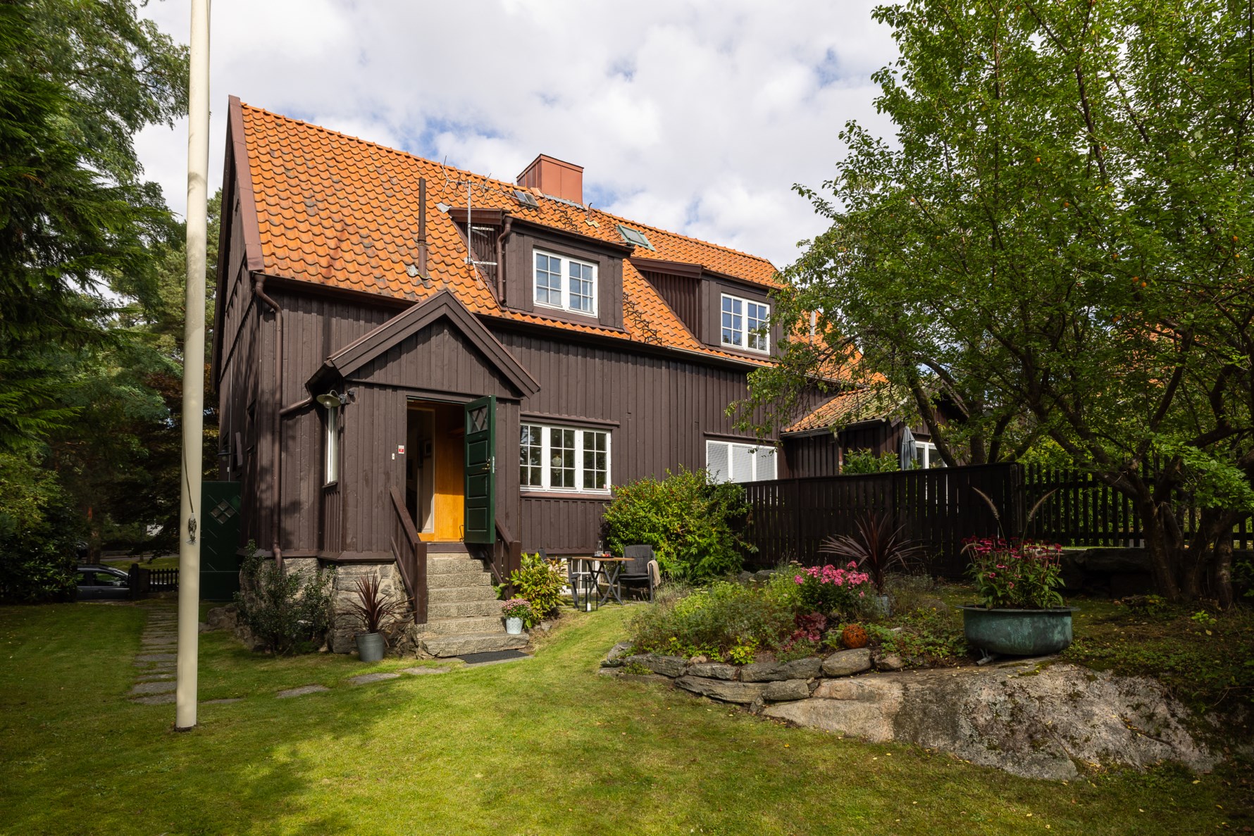 Från Furuplatsen leder en vacker trappa, inramad av naturstensmur upp till detta charmfulla parhus med stark karaktär. Huset, uppfört 1917, är ett utsökt exempel på den nationalromantiska stilen – med småspröjsade fönster, stående träpanel och ett brant takfall. Den bruna fasaden, ett kännetecken för epoken, kontrasterar på ett vackert sätt mot den lummiga grönskan och trädgårdens blomsterprakt.