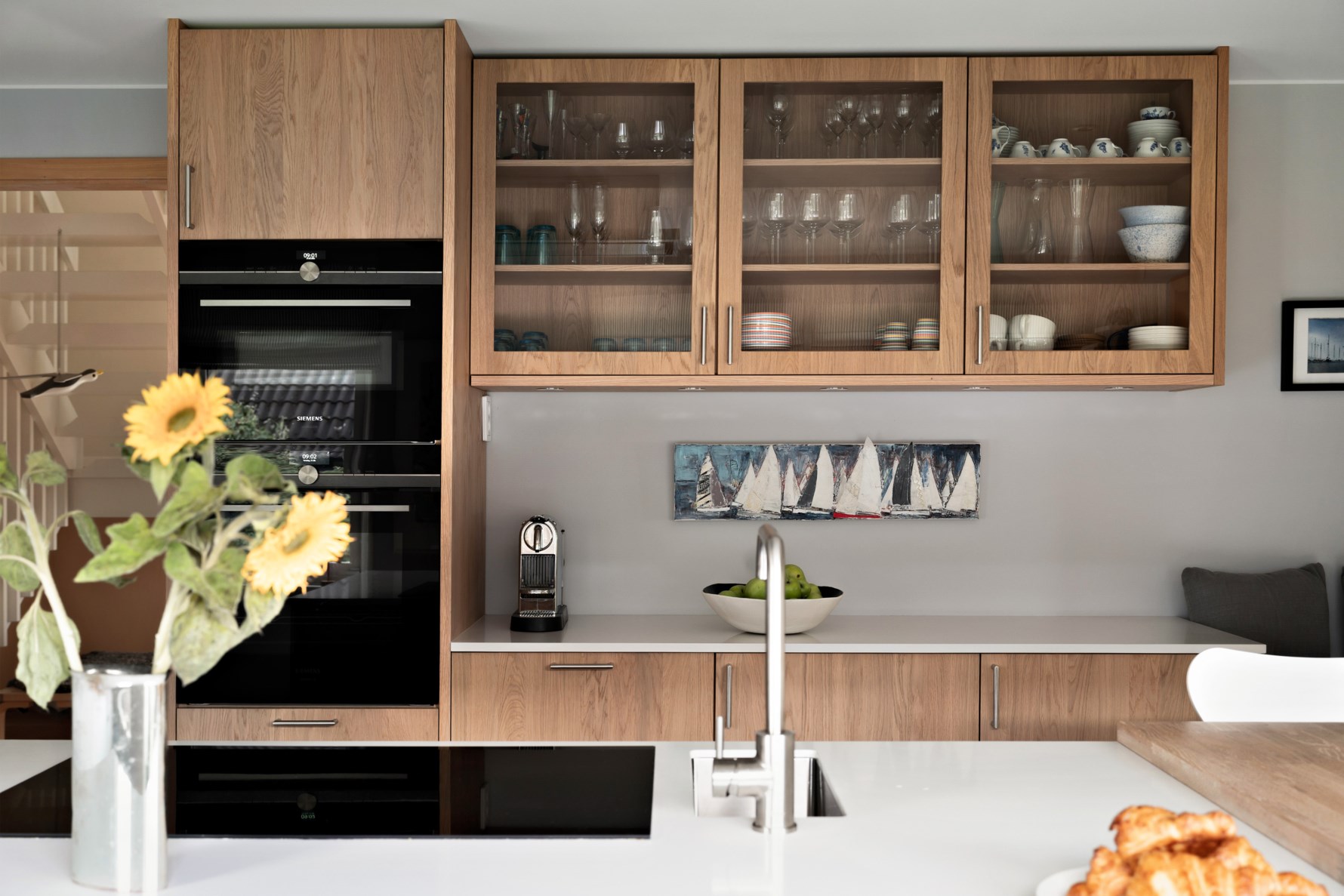 Öppning från matsalsdelen till ett påkostat och stilrent kök från Ballingslöv med bra arbetsytor och gott om förvaring . Perfekt för både vardagsmatlagning och festliga tillfällen. En tilltalande stor köksö med gott om förvaring, plats för barstolar, induktionshäll, mindre diskho och kolfilterfläkt. Fina bänkskivor i en ljus kompositsten. Massiva vitlaserade ekluckor, inbyggnadsugn med varmluft kombi ånga, microvågsugn, integrerad diskmaskin, kyl och frys i fullhöjd. Maskinpark från Siemens. Ett snyggt klinkergolv med behaglig golvvärme. Från köket finns en altandörr som leder ut till trädgården.