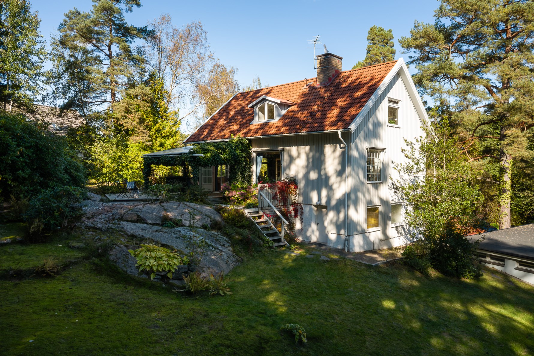 På övre plan finner ni tre sovrum i varierande storlek där en hall med inbyggda garderober binder samman rummen. Det två större sovrummen har plats för dubbelsäng med tillhörande möblemang samt förvaringsmöjligheter i garderober samt de bevarade kattvindarna. Från ena rummet nås villans balkong som vetter mot grönskan i nordväst. Det mindre sovrummet har plats för säng samt skrivbord i den mysiga takkupan. Samtliga rum har tapetserade väggar och golvet pryds av fin parkett. Intill ett av sovrummen finner ni en wc med handfat.
