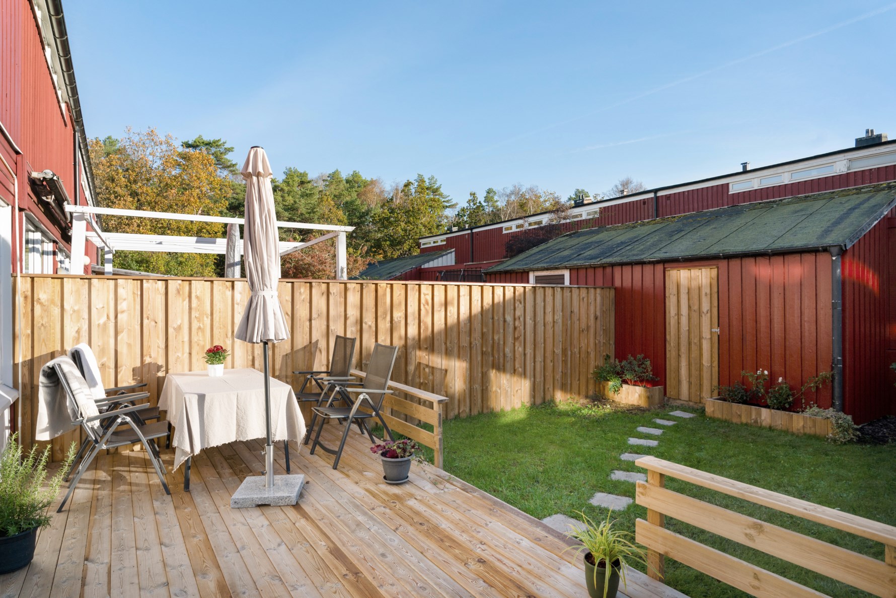 Ljust och rymligt vardagsrum med stora fönsterpartier och direkt utgång till trädgården – perfekt för både avkoppling och sociala tillställningar. Från vardagsrummet nås trädgårdssidan med en härlig träaltan som bjuder in till många sköna stunder utomhus.